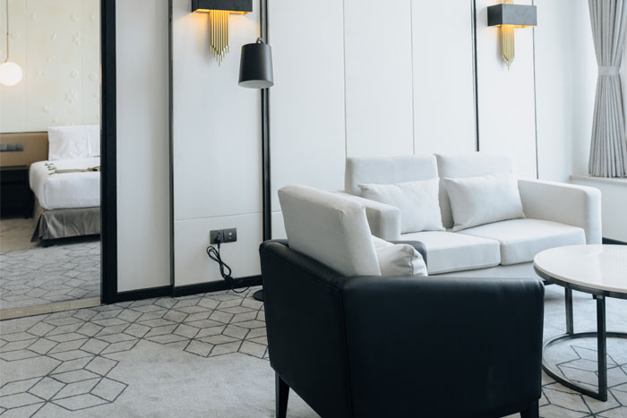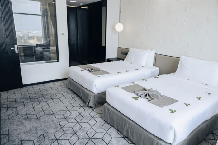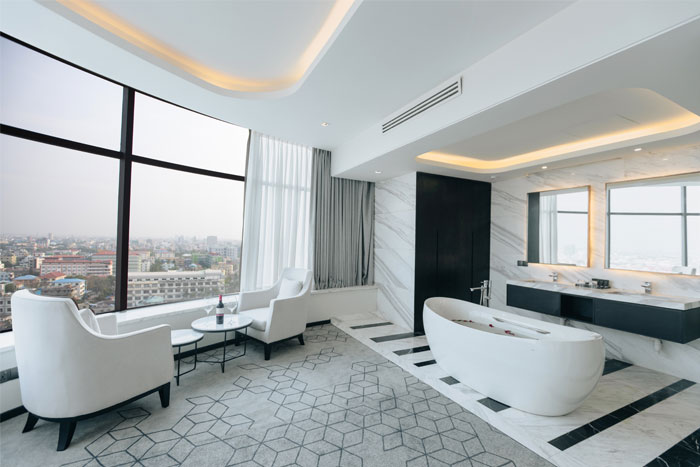 Premier Suit room has 2 bedrooms and 1 living room decorated with modern furniture and is located on the top oor of the Ease Hotel. You can see and enjoy very beautiful mountain view and view of Mandalay Hill from your room. We provide High-speed internet and Safe Box in the room. You can take sound relax with 1129 Square feet spacious room with a modern bath-tab in the bedroom